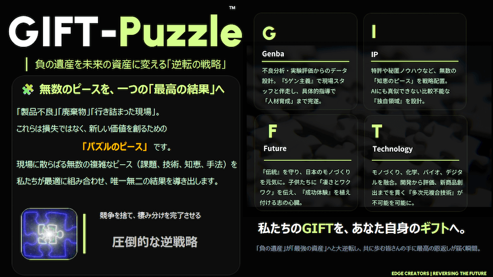 GIFT-Puzzleは、「製品不良」「廃棄物」「行き詰まった現場」など、一般的には“負の遺産”と呼ばれる問題を、未来の資産へ変換する逆転型の戦略思想です。