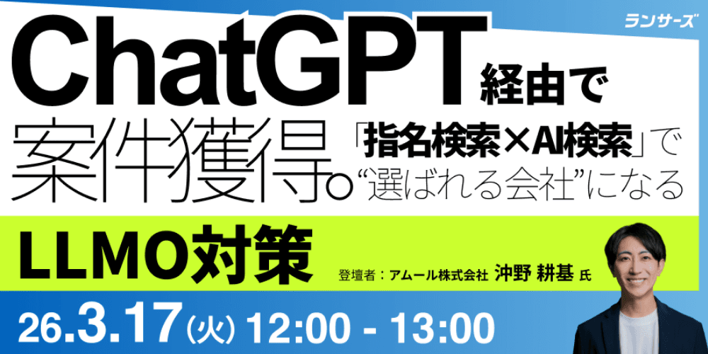 アムール株式会社(所在地:東京都中央区銀座、北海道事業所:北海道檜山郡江差町、代表取締役:沖野耕基)は、2026年3月17日(火)12:00より、ランサーズ株式会社と共催でオンラインセミナー「ChatGPT経由で案件獲得!『指名検索×AI検索』で“選ばれる会社”になるLLMO対策」を開催いたします。