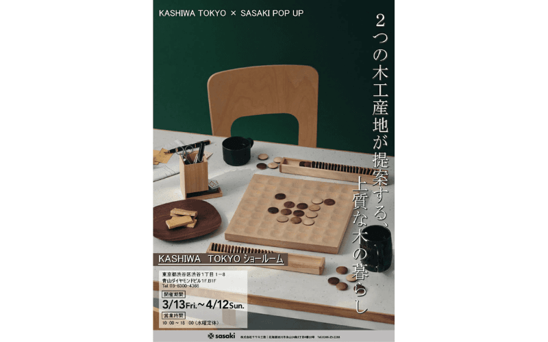 北海道旭川市の木工メーカー 株式会社ササキ工芸 は、岐阜県高山市の家具メーカー 柏木工株式会社 と共同で、合同展示販売イベント 「KASHIWA TOKYO × SASAKI 木工ブランド合同POP UP」 を開催します。会場は東京・青山のKASHIWA TOKYOショールーム。開催期間は2026年3月13日(金)から4月12日(日)までです。