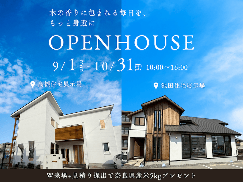 高槻・池田の2つの住宅展示場を別日にご見学いただき、お見積もりをご予約いただいたお客様に、奈良県産米5kgをプレゼントいたします。