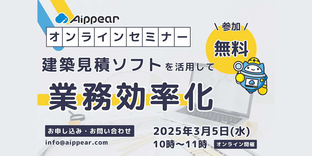 兵庫を代表する企業100選選出企業の株式会社アイピアによる「建築見積ソフトを活用して業務効率化」オンラインセミナー開催のお知らせです。