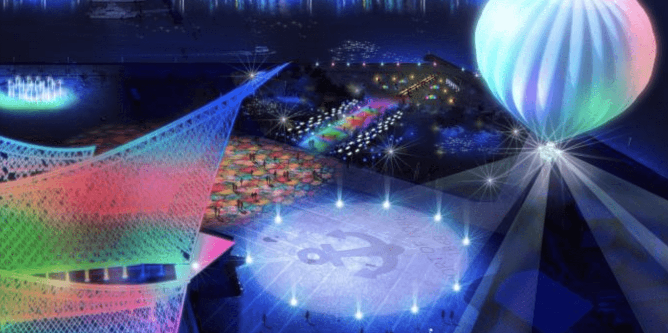 海洋博物館の屋根を、色彩豊かな様々な人が表現しながら曳かれる「だんじり」に見立て、特別なイルミネーションによりカラフルに揺らぎます。噴水広場では、自然の恵みが足元に現れ、吹き上がる噴水が色づきはじめます。