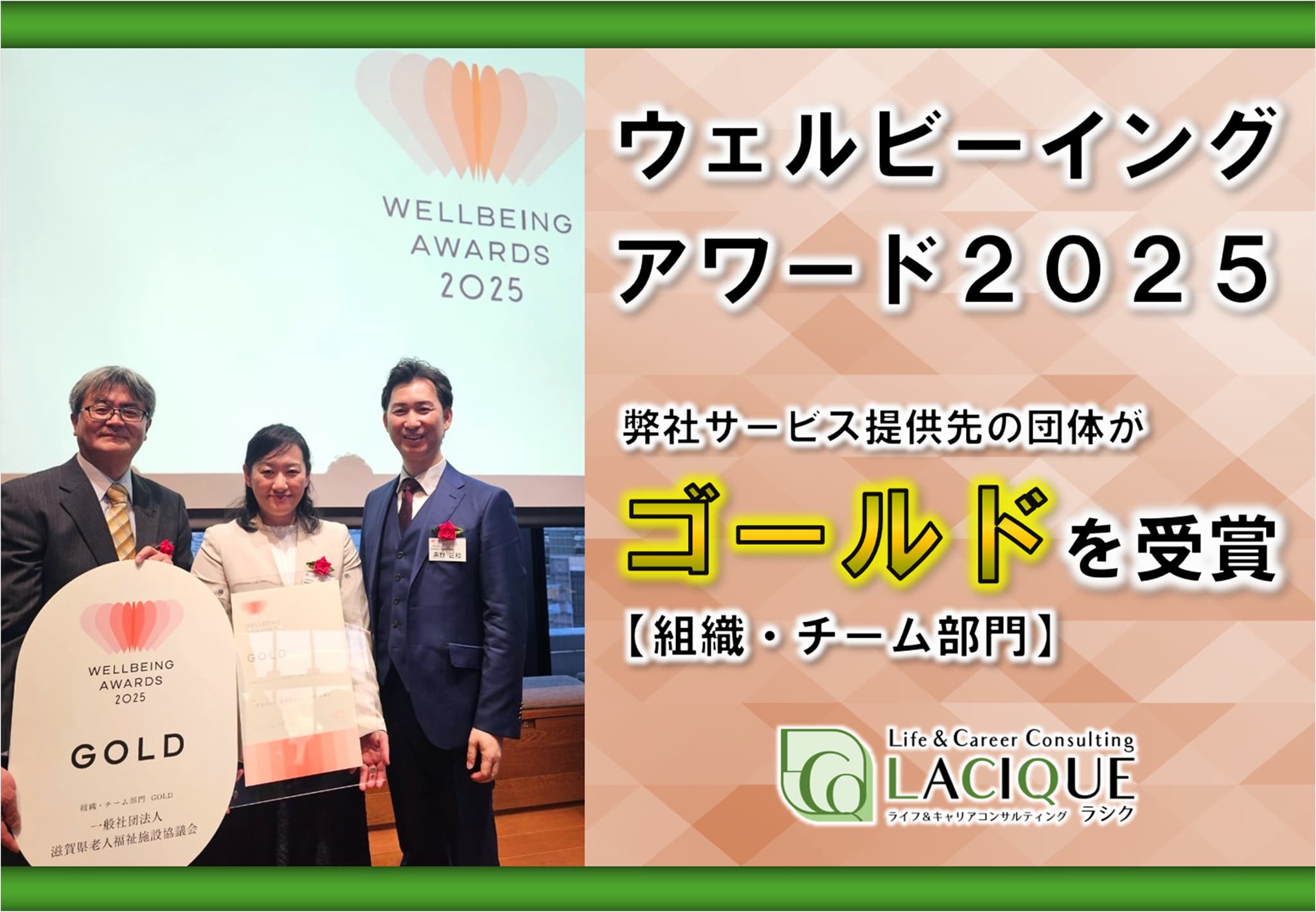 株式会社ラシク(本社:京都府京都市、代表取締役:黒野正和)がサービス提供している一般社団法人滋賀県老人福祉施設協議会が実施する「福祉のキラビトプロジェクト」が、株式会社朝日新聞社などで構成されるウェルビーイングアクション実行委員会が主催する「ウェルビーイング・アワード(WELLBEING AWARDS)2025」の組織・チーム部門において、ゴールドを受賞したことをここにご報告いたします。