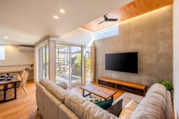 日当たりの課題を解決するため、コの字型の平屋をご提案。中庭と吹き抜けから降り注ぐ光が、住まいの中心まで明るく開放的に照らします。梁にはお施主様とともに伐採した木材を使用し、地域の恵みを活かした開放的な平屋を実現しました。