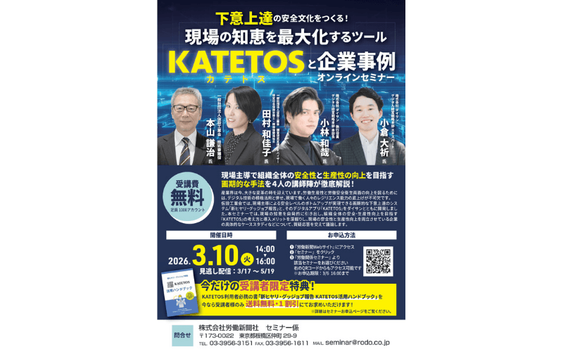 株式会社ダイサン(代表取締役社長:藤田武敏)は、労働新聞社主催の無料オンラインセミナー「下意上達の安全文化をつくる!~現場の知恵を最大化するツール『KATETOS』と企業事例~」に登壇いたします。KATETOSの考え方、導入メリット、導入企業の事例、現場展開の実施方法を解説し、安全と生産性の両立に向けた実践知を共有します。