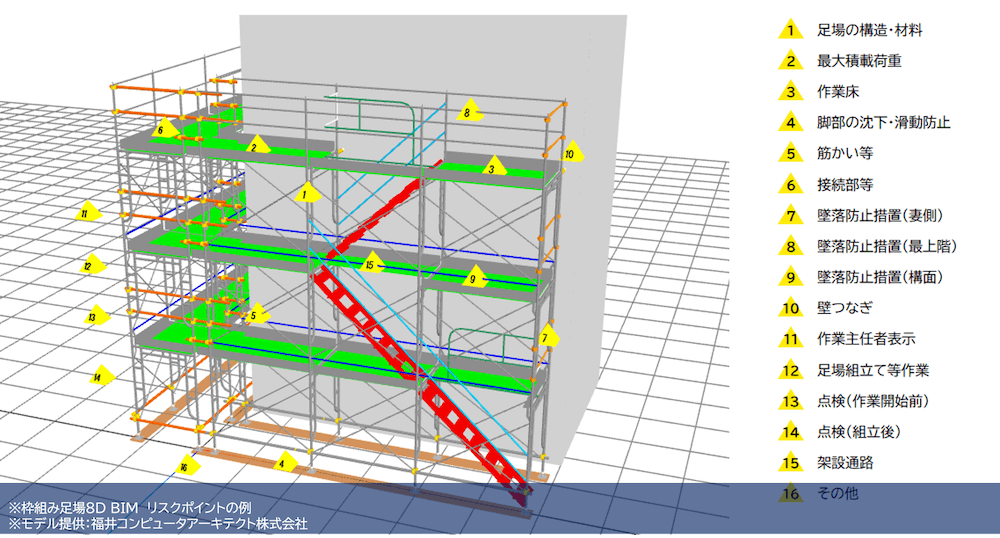 ・BIMデータの属性情報として活用: ゼネコンやBIMオペレーターが足場モデルを作成する際、付与すべき安全情報のガイドラインとして参照できます。