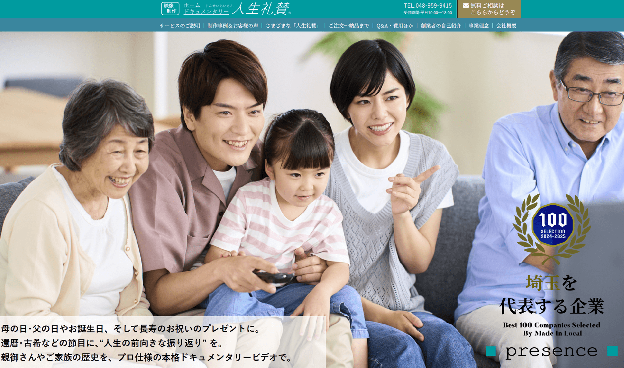 株式会社プレゼンス(埼玉県八潮市、代表取締役 伊﨑 匡志)は、9月11日(木)から、自分史・家族史・夫婦史 映像制作サービス『ホームドキュメンタリー人生礼賛®』の、「敬老の日 記念 特別価格」を実施いたします。
