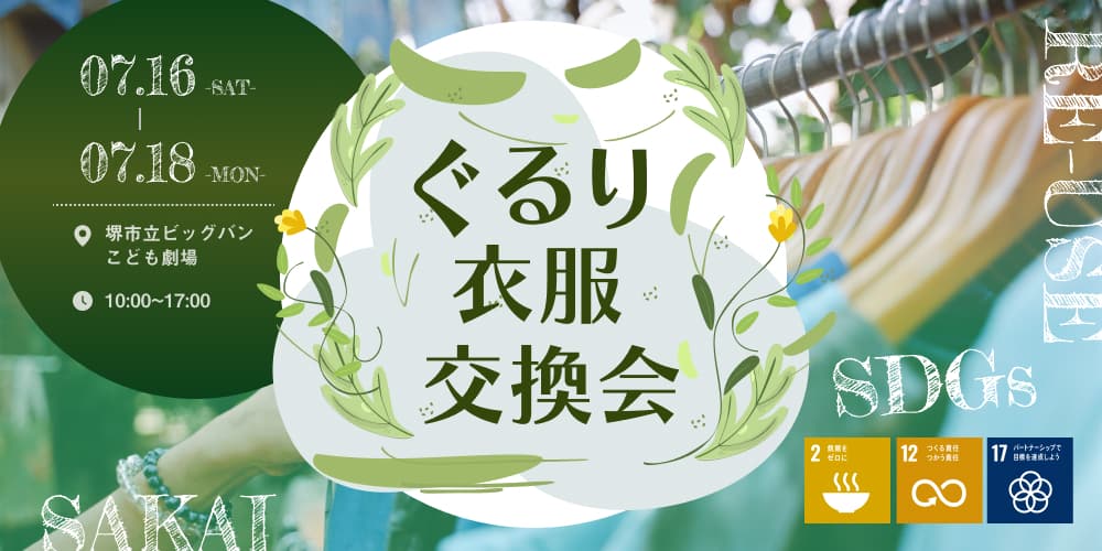 ぐるり お譲り交換会とは、さかいSDGs推進プラットフォームにて行われている、SDGsの推進を目的とした衣服ロス削減イベントです。
