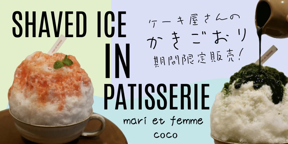 今回は前回ご紹介したケーキ屋さん「mari et femme coco」で夏季限定販売されている全3種のふわっふわなケーキ屋さんならではのかき氷をご紹介します。