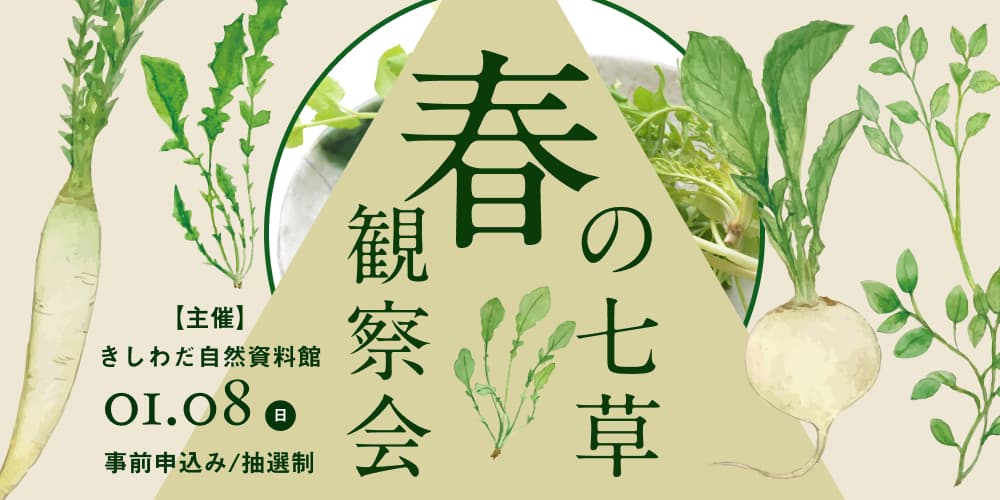【申込方法】往復はがきか電子メール(携帯電話からは不可)で、12月19日(必着)までに、保護者を含む参加者全員の郵便番号・住所・氏名・年齢か学年・電話番号を記入し、自然資料館「1日遅れの春の七草」係までお送りください。申込者多数の場合は抽選を実施します。なお、規定以外の方法でのお申し込みについては、失格となる場合がありますので、あらかじめご了承ください。電子メールおよび往復はがき1通につき1行事の申込でお願いします。