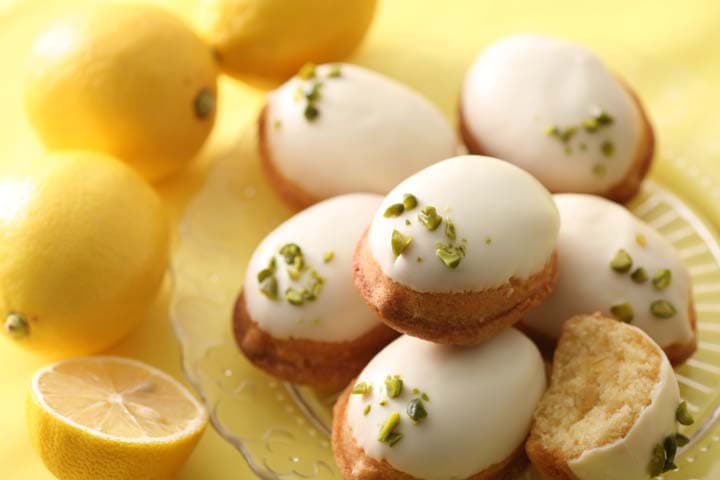 広島県産のレモンペーストをつぶつぶ食感のレモンミンチと一緒に焼き、レモンチョコレートでコーティングした上にピスタチオを散りばめた商品🍋
