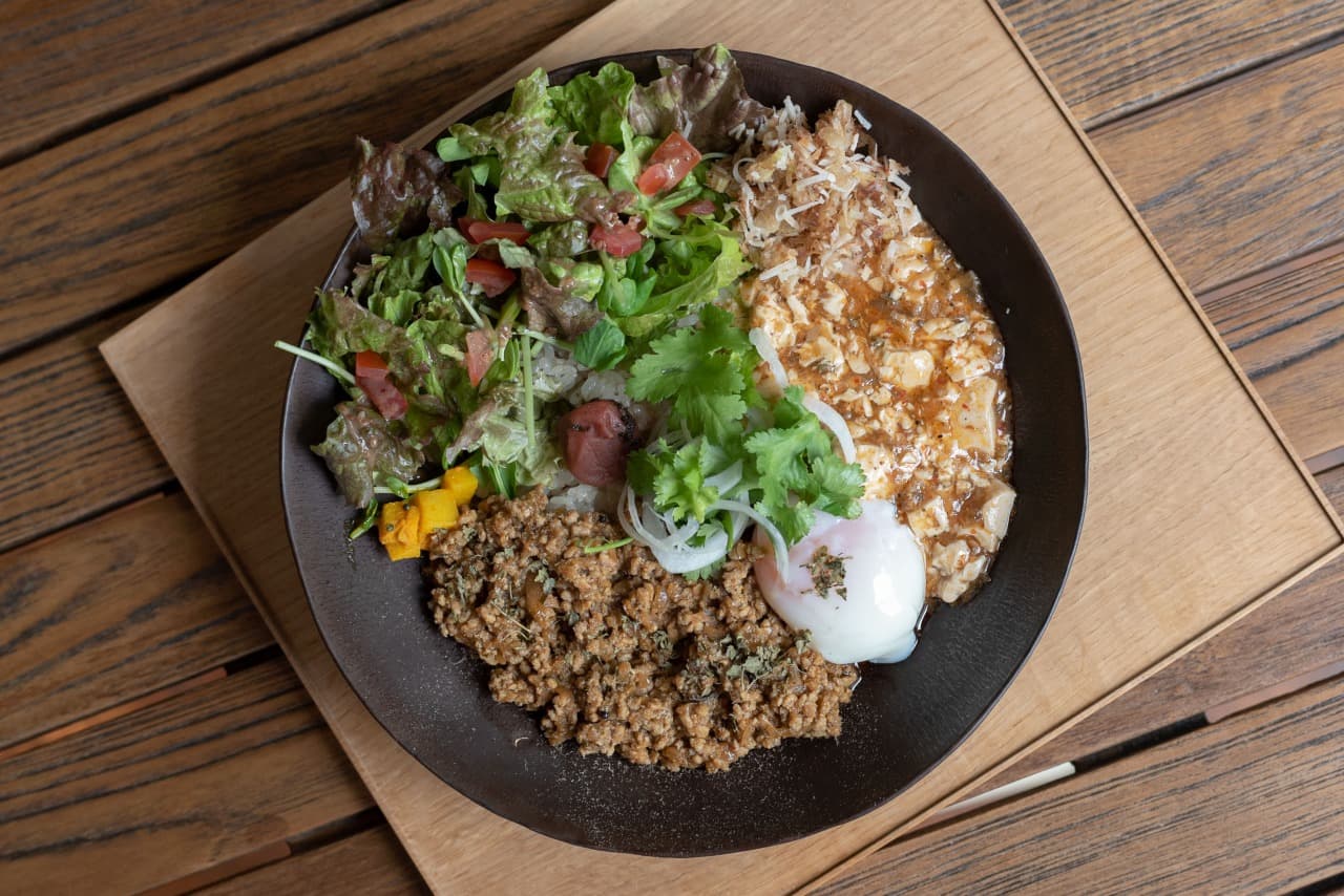 和を感じる旨口のキーマカレー。温玉を崩しながらお召し上がりください。