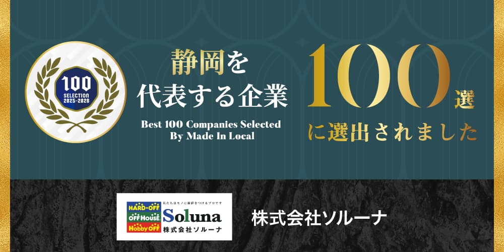 「ハードオフ・オフハウス・ホビーオフ」のリユースショップを運営する株式会社ソルーナ(所在地:静岡県焼津市、代表取締役社長:伊藤隆)が令和7年12月1日「静岡を代表する企業100選」に選出されました。