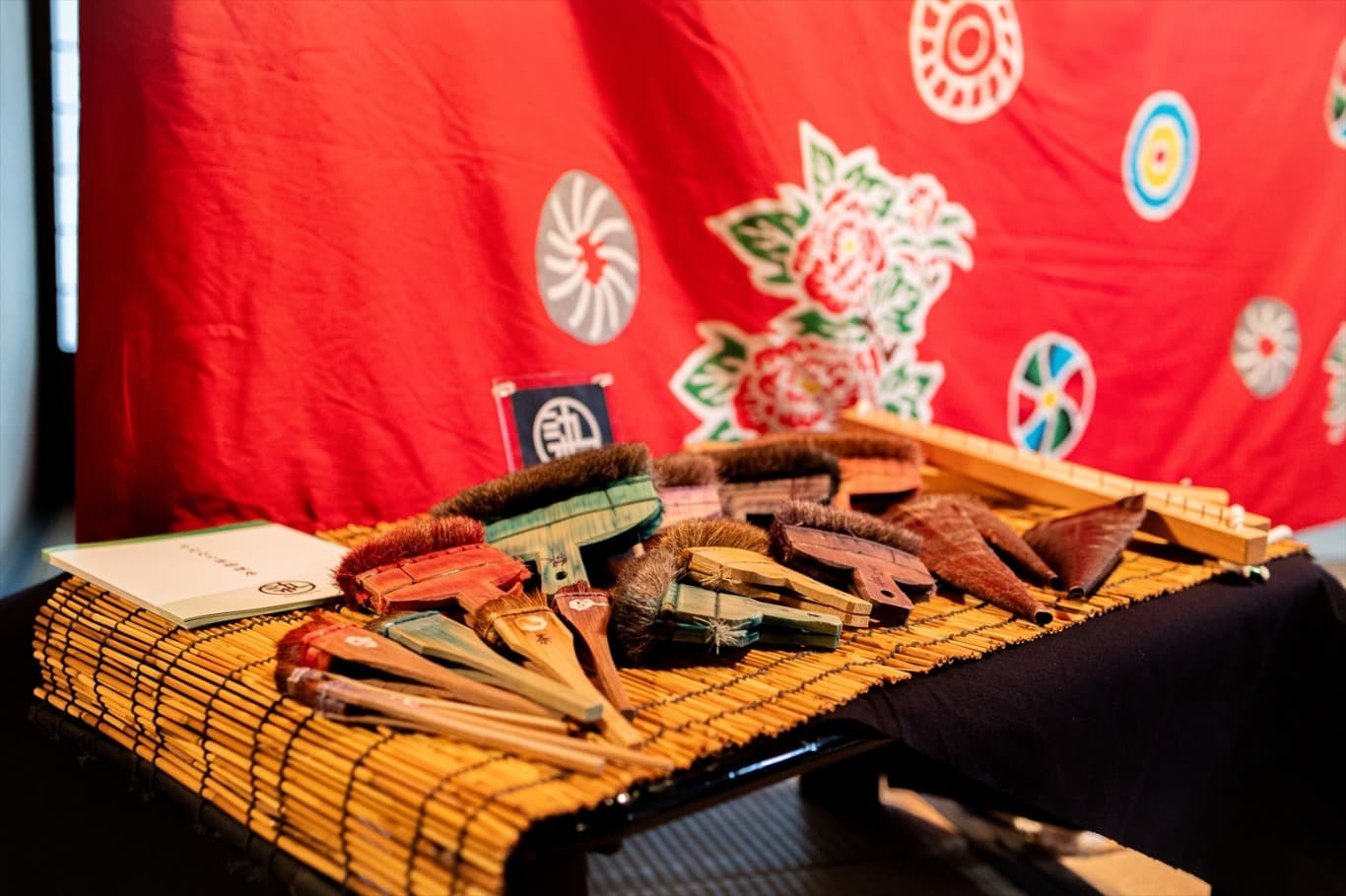 作品は、展示台上でしっかりと見ていただける形で設置され、手仕事の細部や色の重なり、布の質感までをご覧いただけます。あわせて、これまで手がけてきた幟や幕、半纏などの染物も一部展示し、実際の祭礼現場で使われている「生きた染物」の存在感をお伝えします。