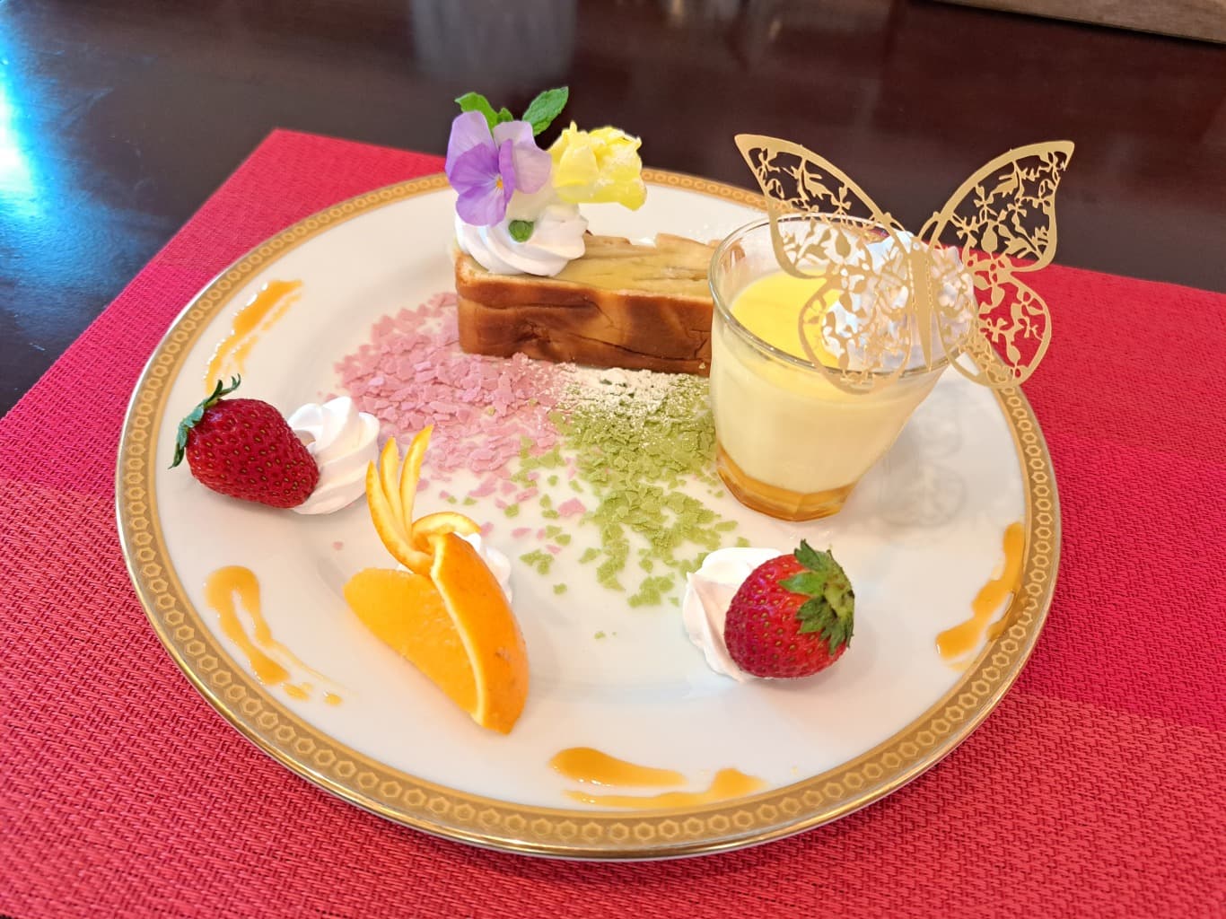 好きなケーキを選ぶことができ、お菓子や手作りソース・ジャム・フルーツなどでとっても可愛く、素敵に盛付けしてくださいます!