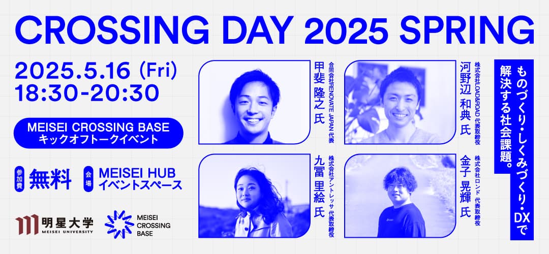 5月16日に開催されるクロッシングデイは、多摩地域にキャンパスを置く大学が共催し、明星大学在学中に多摩地域のまちづくり事業を起業した明星大OBで株式会社ロンドの金子晃輝代表取締役をはじめ、社会の問題解決にさまざまな事業で挑む注目の起業家たちが登壇します。様々なプロジェクトを通じて“挑戦する学生”が育つ起業文化を醸成し、起業する学生のすそ野を広げることで、いずれは明星大学を多摩地域におけるスタートアップの創出拠点にしたいと考えています。