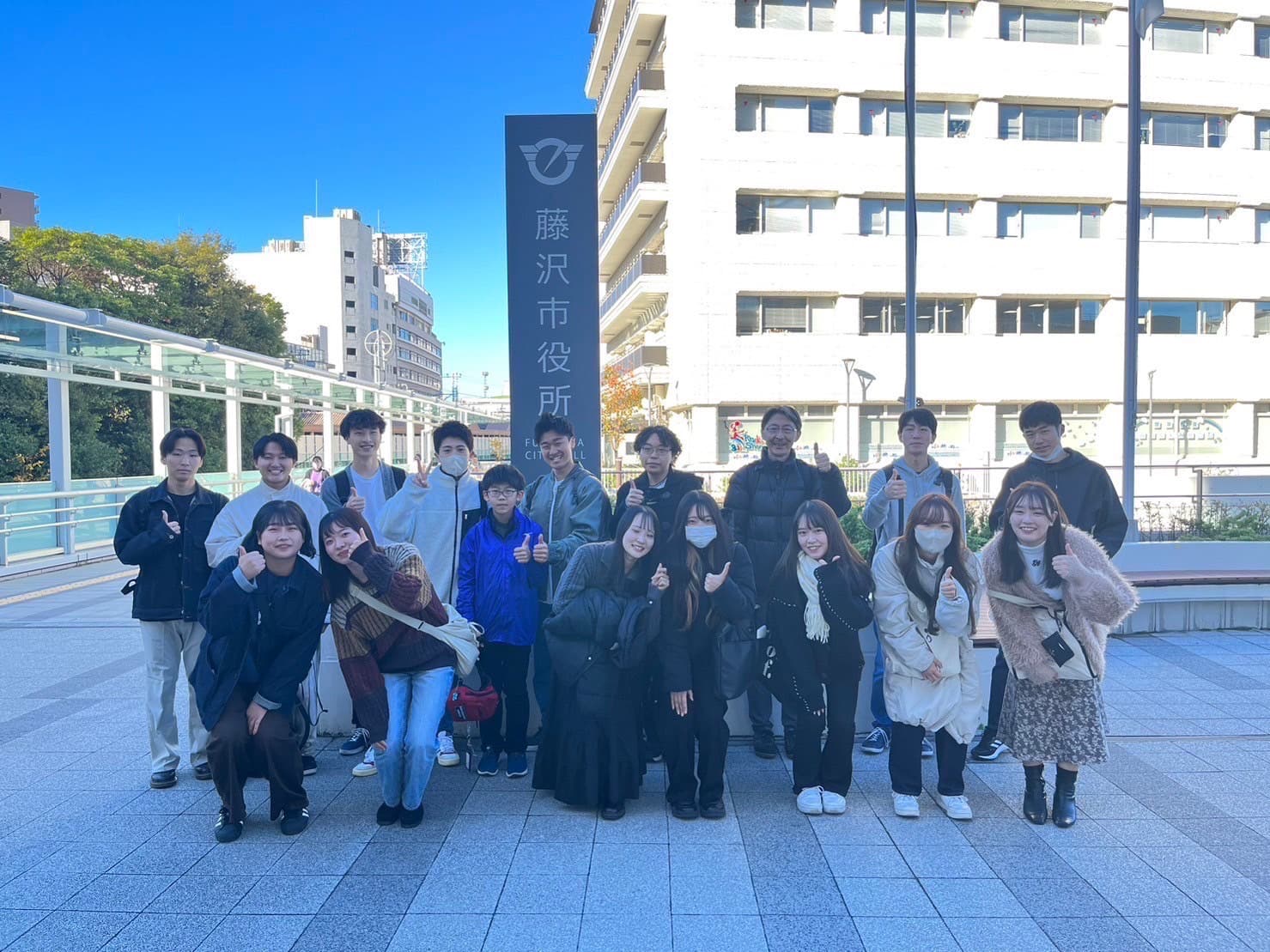 【写真5】藤沢市役所において。このあと、藤沢市議会に行き、議会報告会に参加しました。議会報告会で得た意見をゼミナールとして取りまとめ、藤沢市議会に対して政策提言を実施しております。
