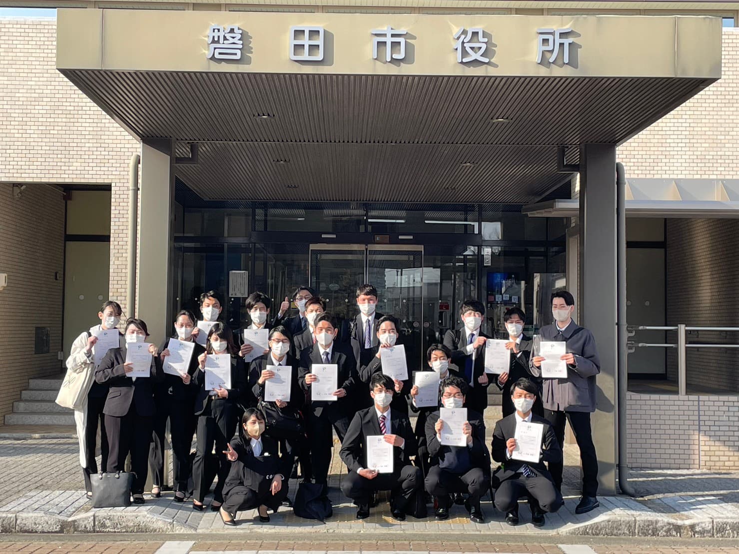 【写真4】磐田市役所の正面玄関前において。磐田市長に政策提言を行いました。ゼミ生が手に持っているのは、磐田市長からいただいた感謝状です。
